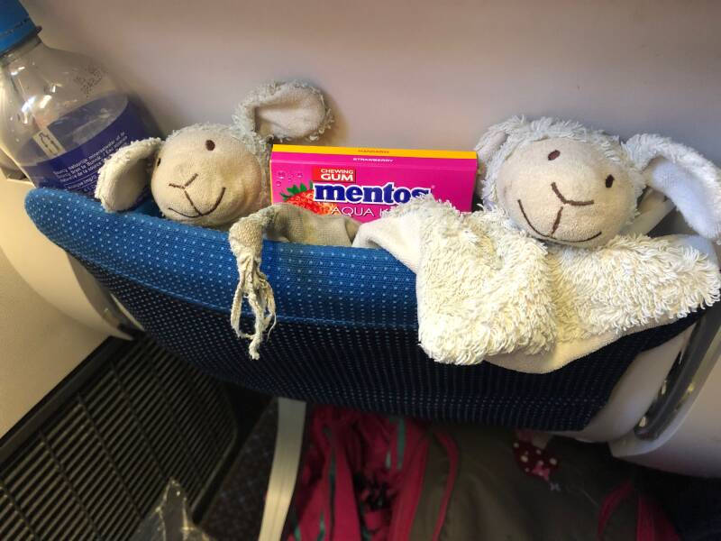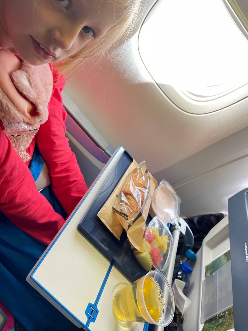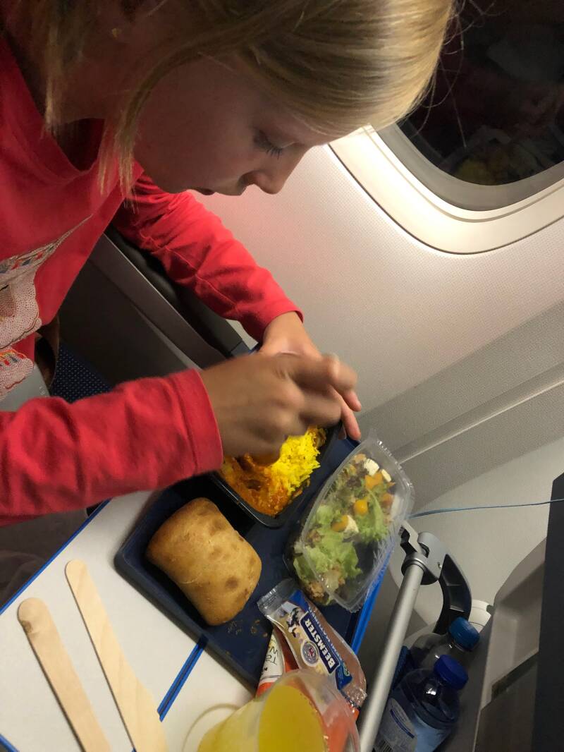 De vlucht was stampvol. We moeten nog steeds een tussenstop maken in Bangkok, dus er waren veel mensen aan boord die met vakantie naar Thailand gingen. Pitrik zat samen met de jongens twee rijen voor Ellis en mij. Ellis zat bij het raam en ik in het midden. Naast mij aan het gangpad zat een Taiwanese jongeman. Vliegen met Ellis is heel leuk. Ze is zo enthousiast over alles. Terwijl de jongens geen hap nemen van het eten dat ze in het vliegtuig voorgeschoteld krijgen, wil Ellis alles proeven. Als er een keuzemenu is, kiezen we altijd allebei iets anders, zodat ze echt alles kan proeven. Ook haar twee favoriete reisgenoten gaan altijd gezellig mee...
