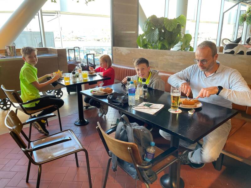 Op Schiphol was het vrij druk. Gelukkig niet zo extreem dat ze buiten stonden, maar we hebben hier en daar flink moeten wachten. Uiteindelijk kwam alles goed. Eerst dachten we dat we geen tijd meer hadden om te eten, maar uiteindelijk hadden we daar toch nog wel even tijd voor. De kinderen wilden graag naar de McDonalds, maar daar wilde iedereen blijkbaar naartoe, dus daar was het zo druk dat er geen beginnen aan was. We vonden nog een ander restaurant waar het ook wel redelijk vol was, maar daar pasten we nog wel bij en de ober garandeerde ons dat we nog konden eten en dat we dan nog weer op tijd bij de gate zouden zijn.