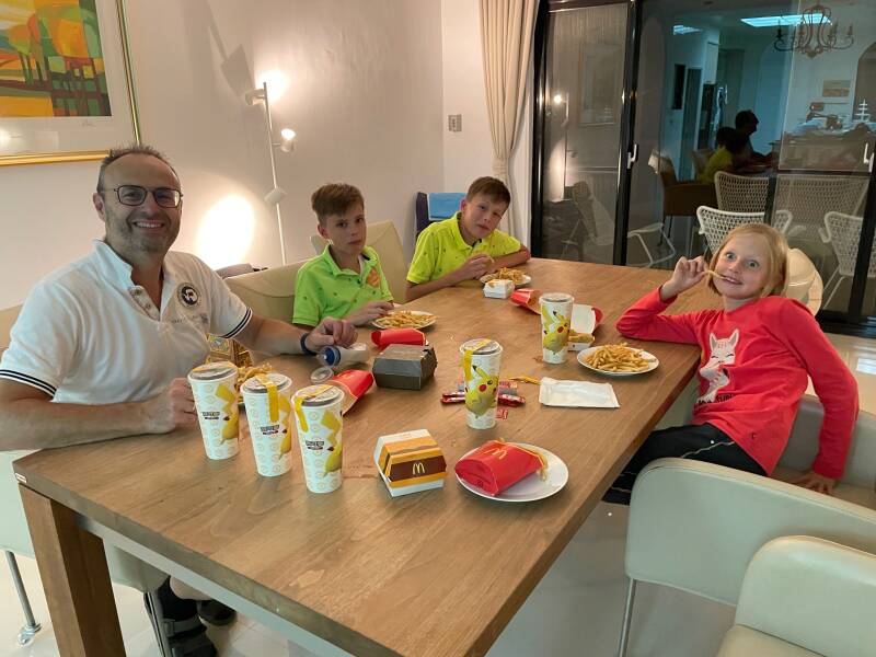 Noah en Ruben hebben honger... nou ja, trek... want zij eten namelijk zo goed als niets in het vliegtuig... hooguit een droog broodje, want ze denken dat ze alles vies vinden. We zitten nu weer in quarantaine, dus we kunnen niet even wat halen of boodschappen doen, maar gelukkig is er UberEats... en om 22.10 uur kwam McDonalds nog even lekker wat fastfood bezorgen en daarna gingen we proberen te slapen.