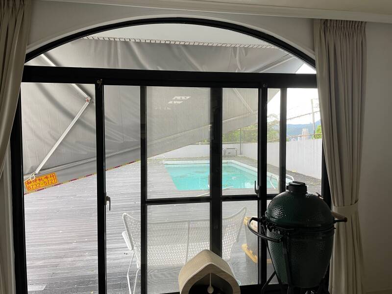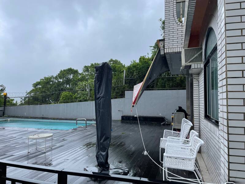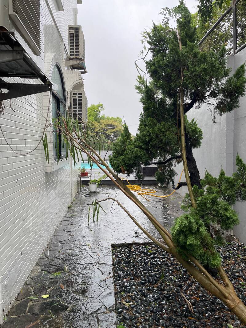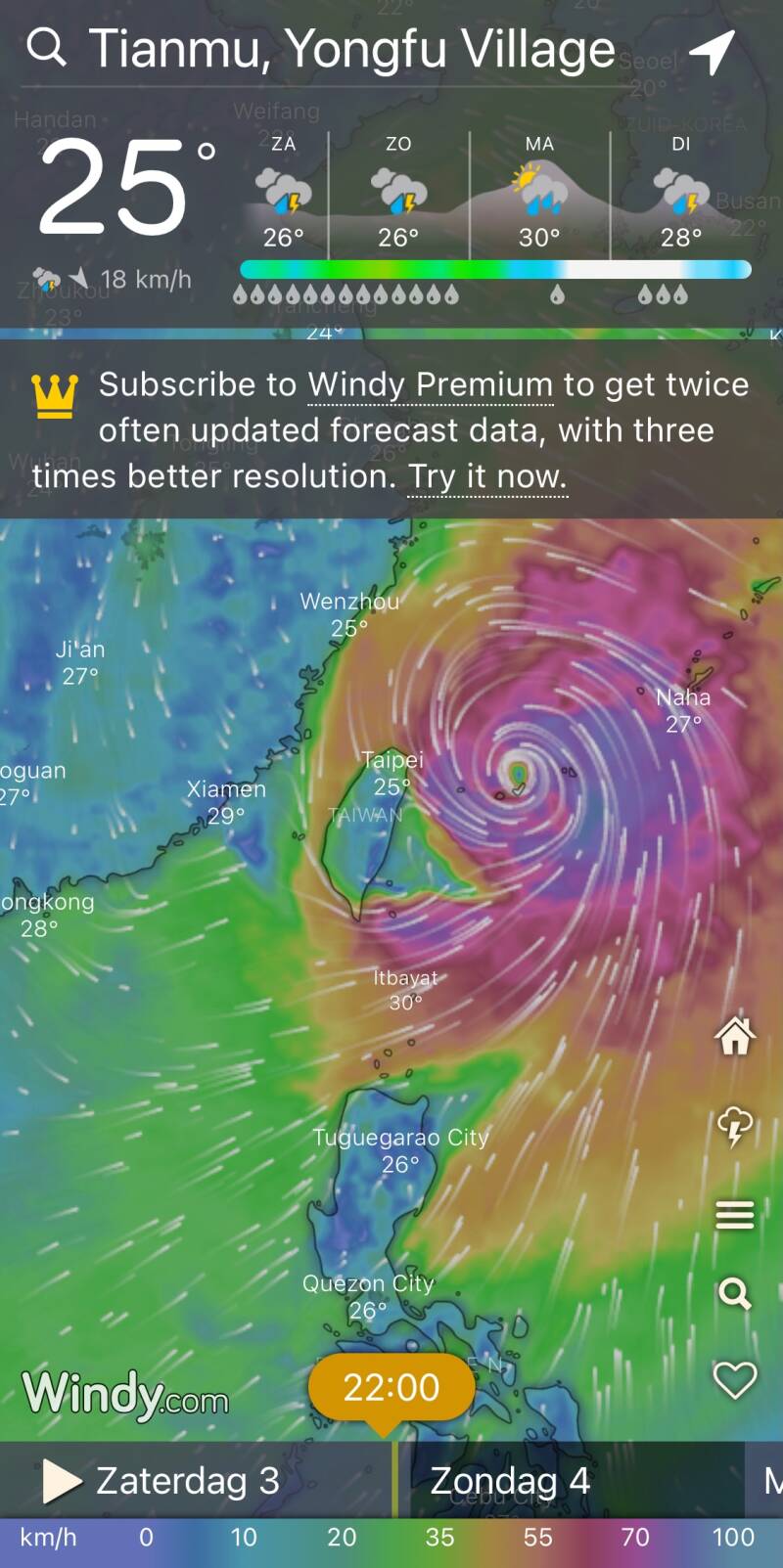We hebben geluk... de typhoon komt niet aan land, maar raast over zee voorbij Taiwan. De typhoon brengt wind, maar ook heel veel regen. Het openbare leven wordt niet platgelegd en alles gaat eigenlijk gewoon door. We vinden het wel een beetje spannend, want je weet nooit wat er kan gebeuren. Pitrik denkt dat het allemaal wel mee zal vallen en daar vertrouw ik op, want hij houdt in verband met z'n werk de weerberichten altijd goed in de gaten. We nemen dus niet heel veel voorzorgsmaatregelen. Terwijl we bij de buren zien dat het grote raam in de woonkamer op dringend advies van de verhuurder met houten platen wordt dichtgespijkerd. Bij ons hangt het zonnescherm in de keuken nog uit. Als ik dat op donderdag wil opdraaien, blijkt dit niet gaan. Dit zonnescherm is elektrisch en de motor doet niets... We hebben de afgelopen maanden ontzettend veel problemen (gehad) in en om het huis, maar daarover wil ik nog een ander blog schrijven. We hebben ook heel veel problemen met de elektriciteit en we denken nu dat daardoor de motor van het zonnescherm kapot is gegaan. Ik meld het meteen bij de tussenpersoon en deze geeft aan dat ik me geen zorgen moet maken en dat de verhuurder vrijdagavond langs komt om het zonnescherm op te draaien. Ik vind dat erg laat met het oog op de typhoon en ik vraag me af hoe hij dat gaat doen, want de motor doet het niet en ik zie ook nergens een mogelijkheid om het met de hand op te draaien. Maar goed, er zit niets anders op dan af te wachten... Op vrijdagavond komt de verhuurder en het lukt hem ook niet om het zonnescherm op te draaien, dus hij bindt het vast met een touw in de hoop dat het dan niet kapot zal waaien...