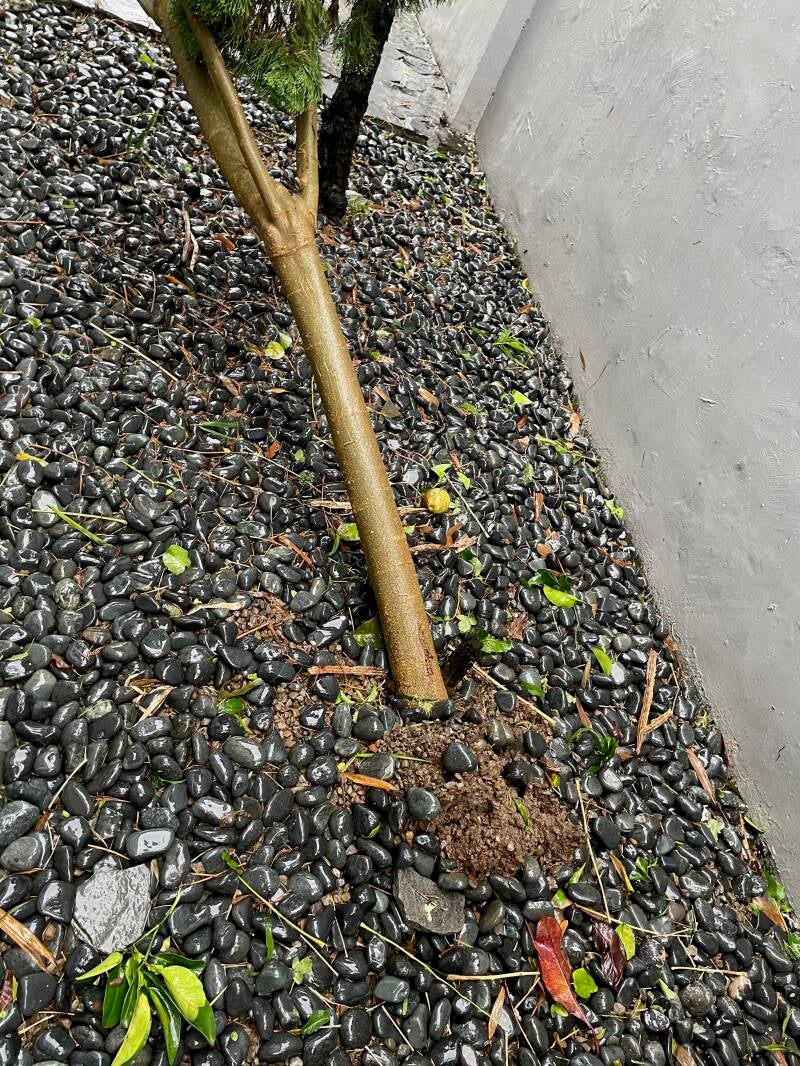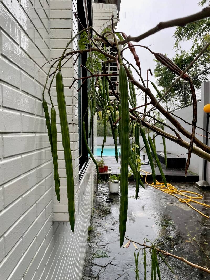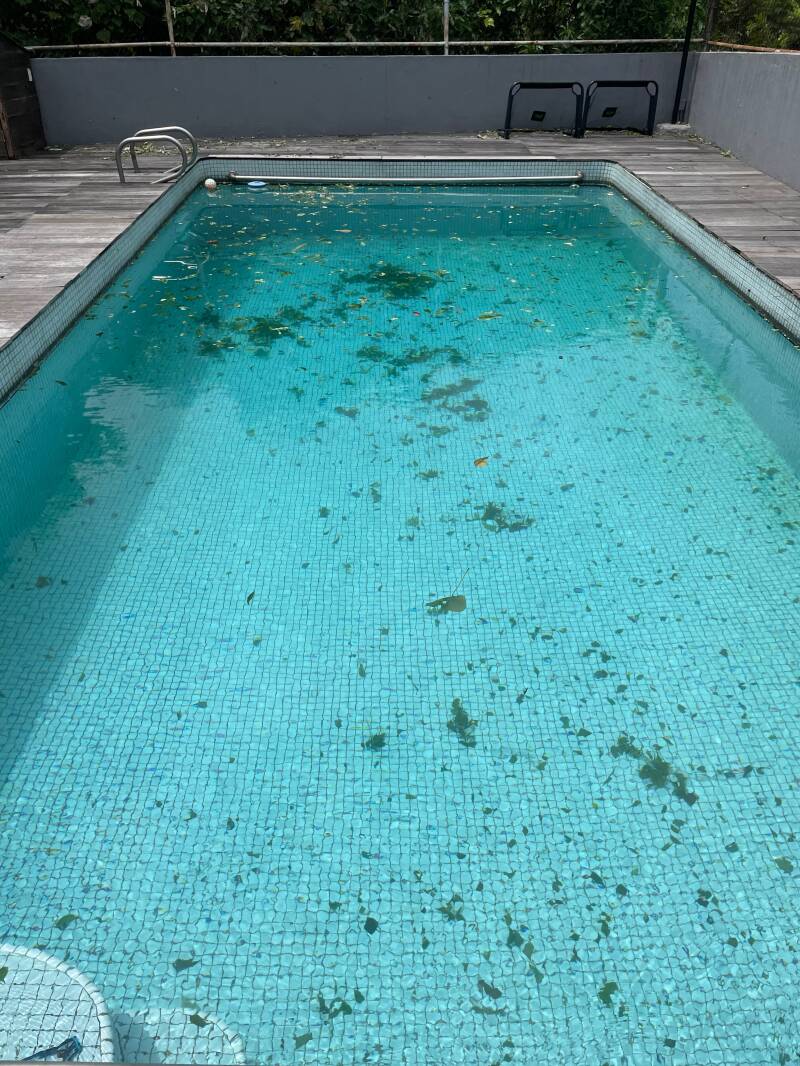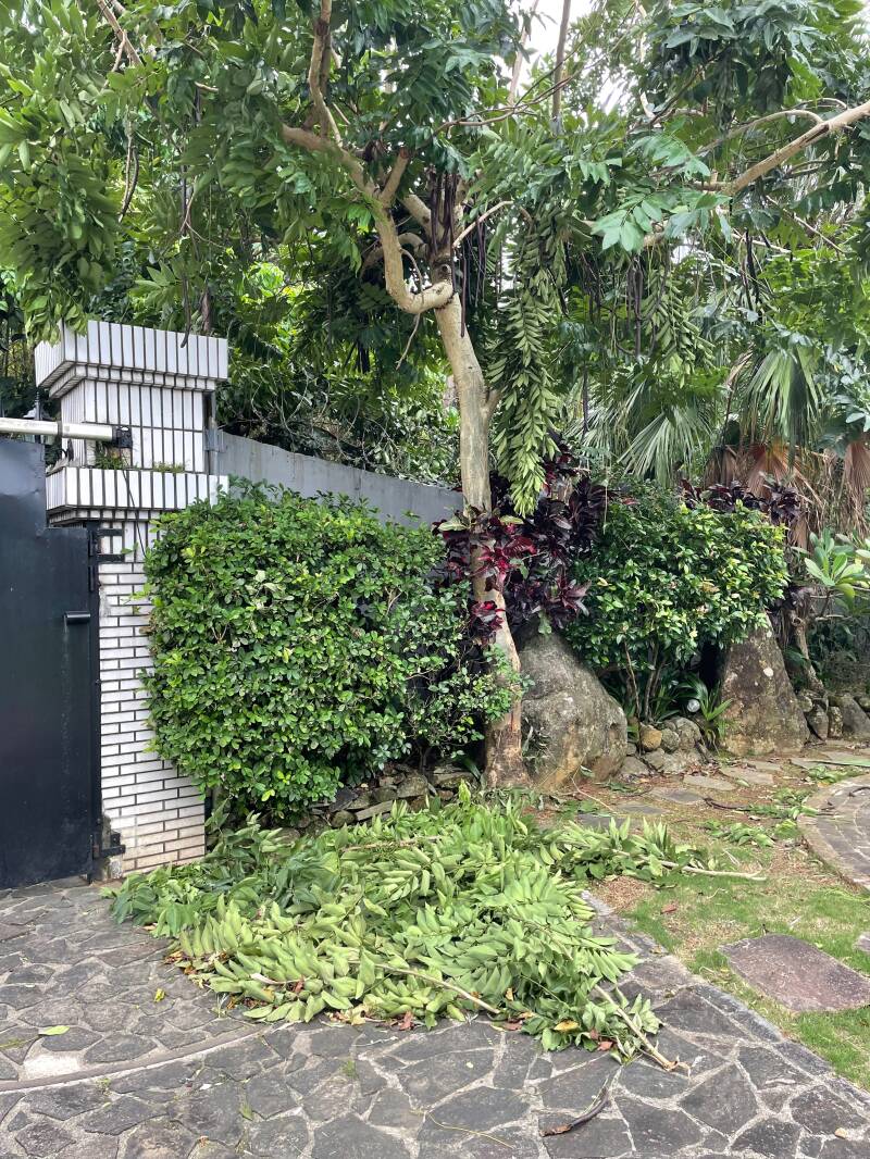 Verder heel veel afgewaaide takken en bladeren en veel daarvan ligt in het zwembad... Dat is zo jammer, want tot voor de typhoon was het water zo mooi helder en schoon en het had een heerlijke temperatuur om in te zwemmen, maar dat lijkt in één keer voorbij...