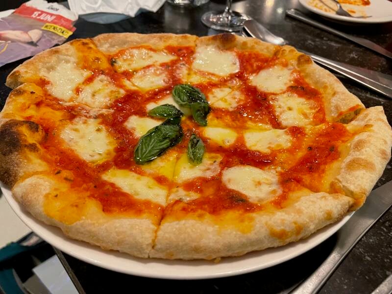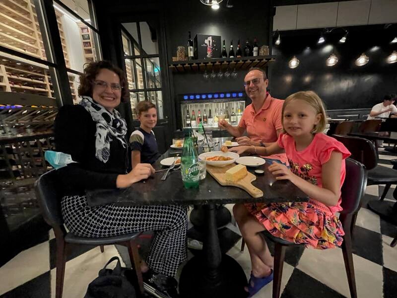 's Middags ging Noah logeren bij Loek en wij gingen 's avonds met z'n vieren uit eten bij een leuk Italiaans eetcafé. De regen kwam met bakken uit de hemel, dus we gingen met de auto. We hadden geluk, want we konden redelijk dichtbij parkeren. Pitrik had gebeld met het restaurant, maar reserveren was niet mogelijk. Pitrik ging dus eerst kijken of er plaats was voordat we met z'n allen door de regen gingen banjeren. Even later belde hij dat hij een tafeltje had en toen ben ik samen met Ruben en Ellis ook naar het restaurant gaan lopen. De bediening verliep een beetje chaotisch, maar dat zijn we hier in Taiwan inmiddels wel gewend. Het eten was heerlijk! We hebben vooral genoten van de mozzarella... Ellis heeft ook zo zitten genieten. Toen we weggingen, zagen we dat je de mozzarella ook bij hen kunt kopen voor thuis, dus dat is helemaal leuk!