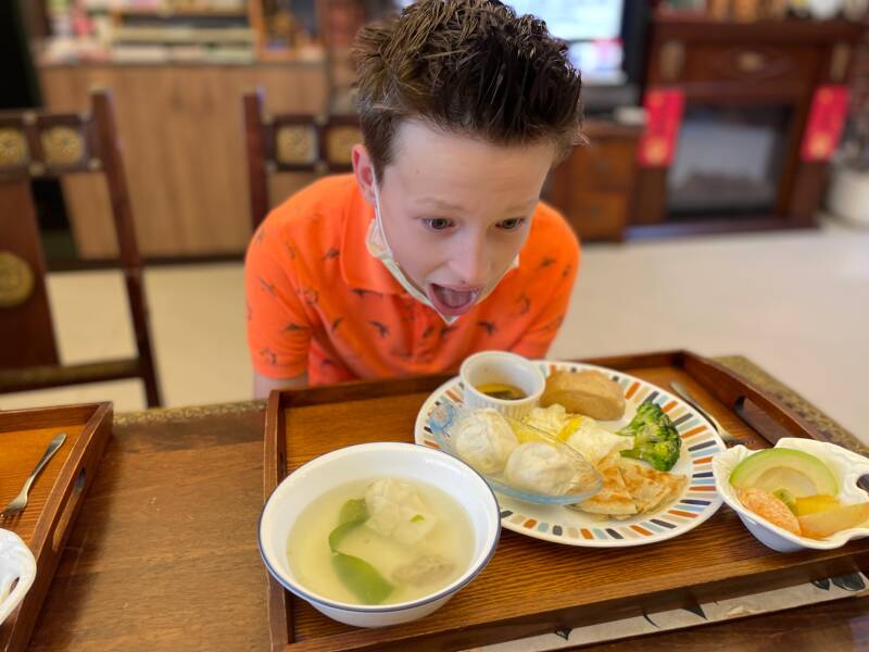 We begonnen de dag vanmorgen met een Taiwanees ontbijt... Nou, dat was me wat... Ellis ging eerst even in de protest modus, maar even later ging ze nog wel aardig buiten haar comfort zone. Ze heeft verschillende dingen geproefd en uiteindelijk ook echt nog wel wat gegeten. Noah en Ruben zagen het ontbijt helemaal niet zitten en waren een stuk moeilijker over te halen om wat te proeven. Na heel lang aandringen hebben ze een paar dingen geprobeerd, maar het was allemaal niet aan hen besteed, helaas. Als ik heel eerlijk ben, was ik er ook niet echt van gecharmeerd, maar ja... ik heb nog wel m'n best gedaan om het meeste op te eten, maar een paar dingen heb ik toch laten liggen...