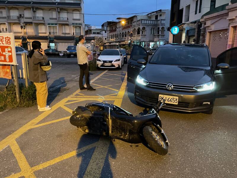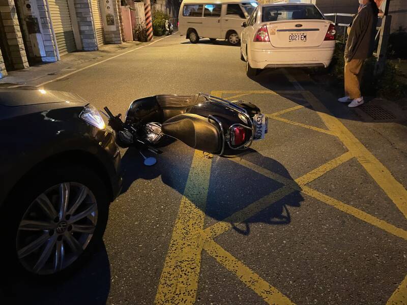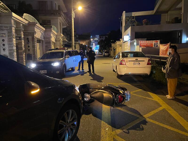 Zowel Pitrik als de scooterrijdster moeten blazen, want dat is de standaard procedure. De politie neemt een verklaring op van de scooterrijdster. Ondertussen komt er een tweede politieauto. Met allerlei meetapparatuur wordt de situatie in kaart gebracht. We hebben geen idee wat er allemaal gebeurt en waarom. Pitrik heeft intussen contact gezocht met onze autodealer in Taipei. Deze jongeman heeft ook de verzekering en alles geregeld en heeft aangeboden om ons altijd te willen helpen als er iets is. Inmiddels weten we dat het niet uitmaakt wie z'n schuld het echt is, want het is hier bij wet geregeld dat de automobilist altijd fout is bij een ongeluk met een scooter... Eigenlijk heel frustrerend, want de scooterrijders rijden hier echt als kamikazepiloten. Ze komen overal vandaan en halen zowel binnendoor als buitenom in en dat mag allemaal. Als automobilist heb je dan de schone taak om ze allemaal mis te houden. Nou, dat is dus bijna een onmogelijke opgave. Wij hebben geen schade aan de auto. De scooter een krasje op de spiegel en de scooterrijdster een schram op haar knie. Niet echt een zaak voor de verzekering... dus we krijgen het advies om de zaak voor 1000 ntd af te kopen. De scooterrijdster heeft inmiddels aardig wat mensen om haar heen verzameld en er wordt druk overlegd. De jongens van het B&B fungeren voor ons als tolk. Uiteindelijk geeft de scooterrijdster aan dat ze 2000 ntd wil... Nou, dat gaat mij te ver... 1500 ntd en anders gaat het gewoon naar de verzekering. De jongen van het B&B moet er om lachen dat ik probeer af te dingen, maar gaat toch de boodschap overbrengen. Er wordt weer even druk overlegd en dan gaan ze akkoord. Zo... dit voelt voor ons toch een stuk beter! Maar goed, hoe nu verder, want de politie is inmiddels vertrokken en het moet wel goed afgehandeld worden, zodat we straks niet alsnog voor een verrassing komen te staan. Er blijkt een soort schikkingsformulier te bestaan wat je kan downloaden. Wij geven aan dat we alleen een Engels formulier ondertekenen en absoluut geen Chinees formulier. Dat begrijpen ze. De scooterrijdster download het betreffende formulier en gaat dan naar de dichtstbijzijnde 7-eleven om het formulier te printen. Als ze terug komt wordt het formulier verder ingevuld en handelen we alles verder af.
