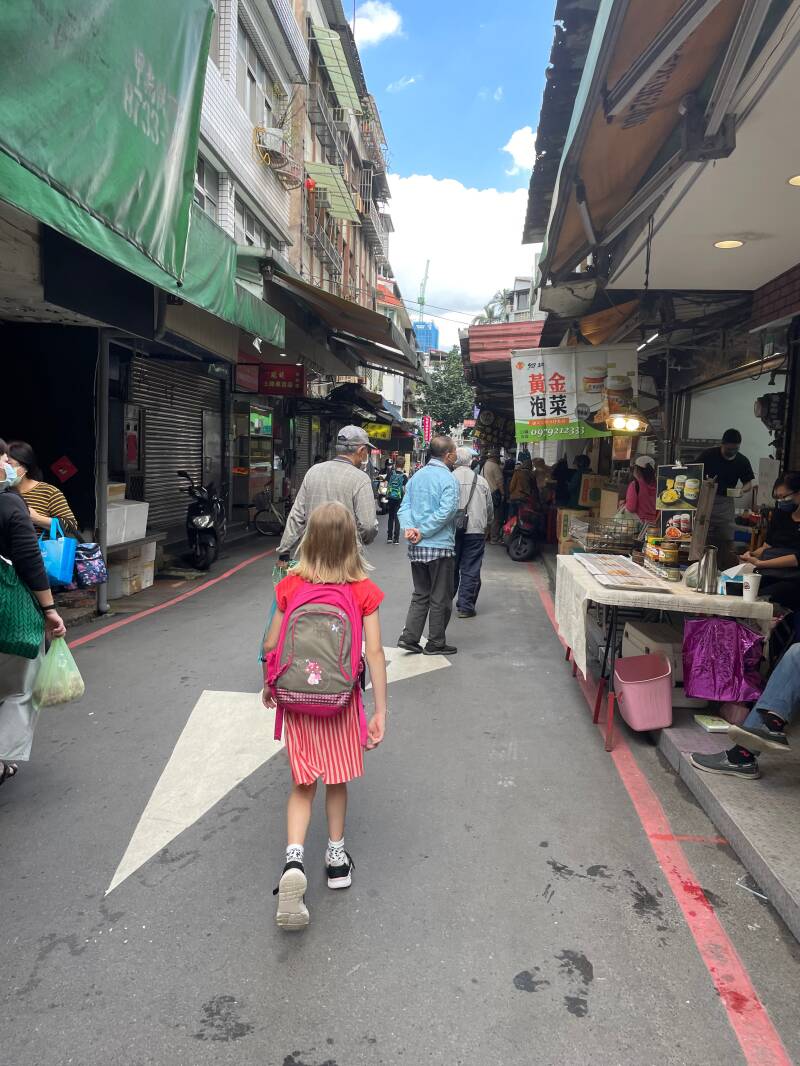 We zijn nu ook vlakbij de 'Shidong Market', een overdekte markt. Ik heb er al veel over gehoord, maar ik ben er nog nooit geweest en nu we er zo dichtbij zijn, stel ik voor om er even overheen te lopen. De kinderen hebben er niet zo heel veel zin in, maar we doen het toch.