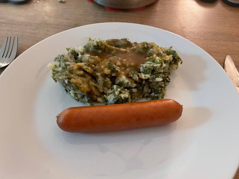Als we thuis zijn, ga ik het eten koken. Afgelopen zaterdag vond Pitrik ineens onverwacht boerenkool in de winkel, dus dat moest gekocht worden en dat eten we vandaag, ook al is het 25 graden! Het is niet zo gemakkelijk als de zakken boerenkool die je in Nederland bij de supermarkt koopt, want ik moest deze nog plukken, wassen en snijden, dus het duurde wat langer voordat het op tafel stond, maar met 'smoked' brats' een soort rookworst 'made in the USA' en een zakje Unox Stamppotjus uit Nederland heeft iedereen ervan gesmuld.
