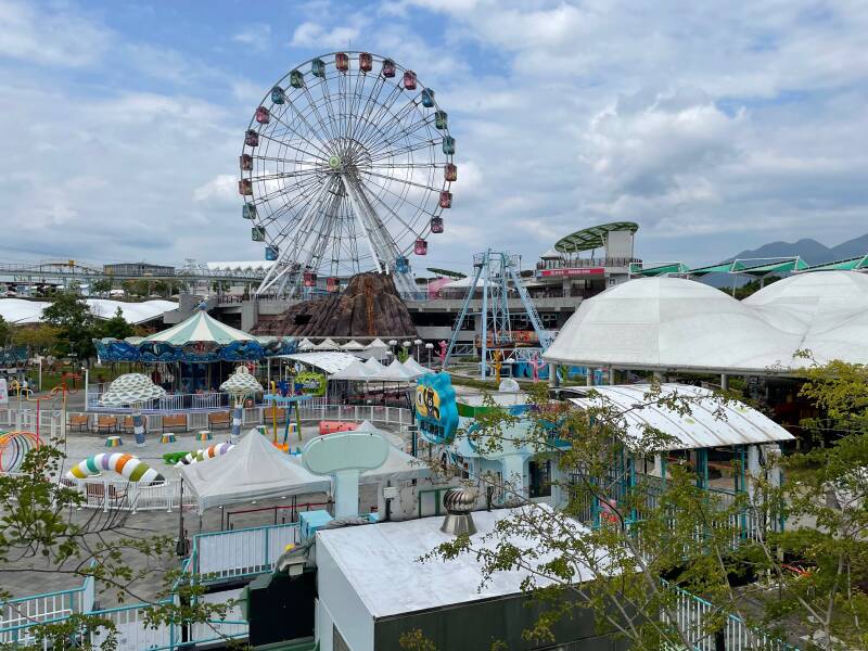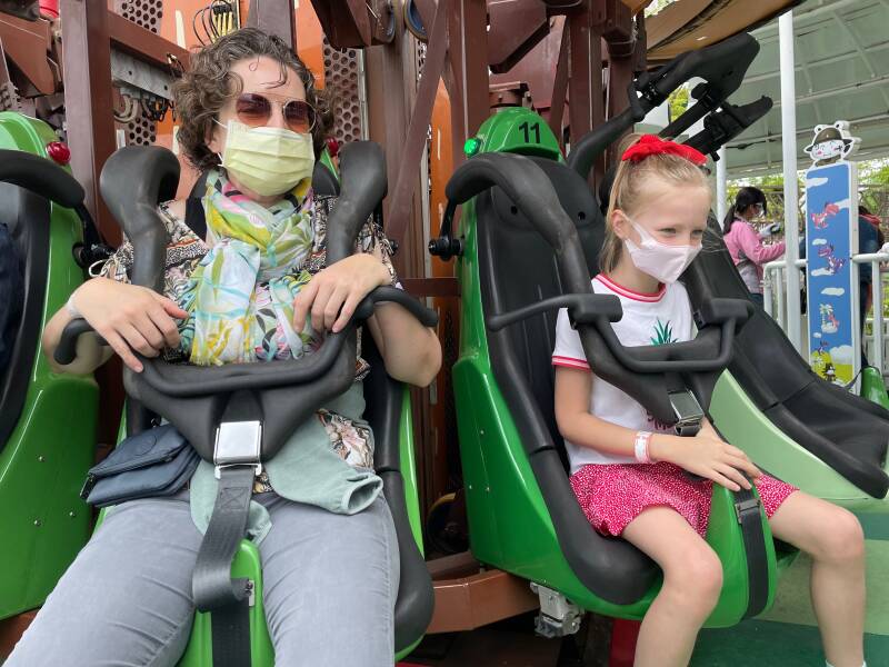 We hebben al gehoord dat je de attracties kan betalen met je Easy Card, een soort OV-chipkaart, maar dat je ook een entreekaartje kan kopen en dan zijn de meeste attracties verder gratis. Het is rustig bij de ingang en na het scannen van de QR-code (Covid-19 tracing), temperatuur meten en handen desinfecteren loodst een medewerker ons naar de kassa. Er zijn twee kassa's open. De medewerker aan onze kassa blijkt geen Engels te spreken, dus worden we doorverwezen naar de andere kassa. Deze medewerker spreekt wel Engels, maar het valt nog niet mee om precies te begrijpen wat de mogelijkheden zijn en hoe het werkt. Uiteindelijk adviseert ze ons om een bepaald toegangskaartje te kopen voor ons allemaal, dus dat doen we dan maar. We betalen, krijgen een polsbandje en mogen naar binnen.