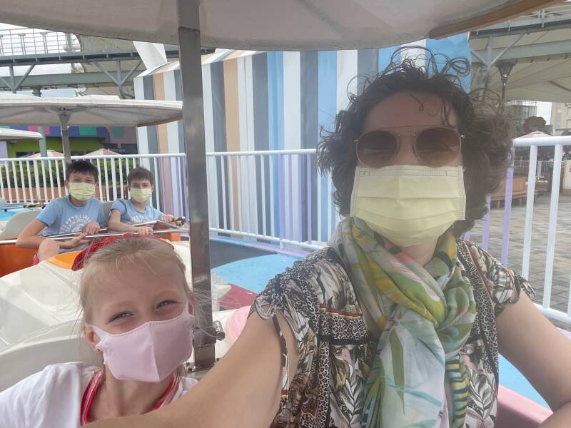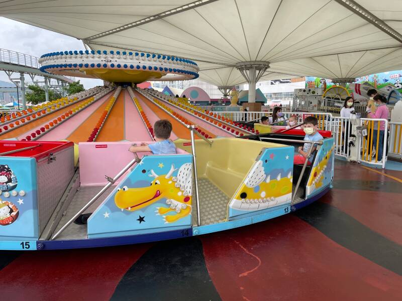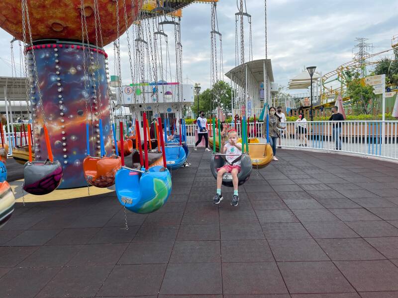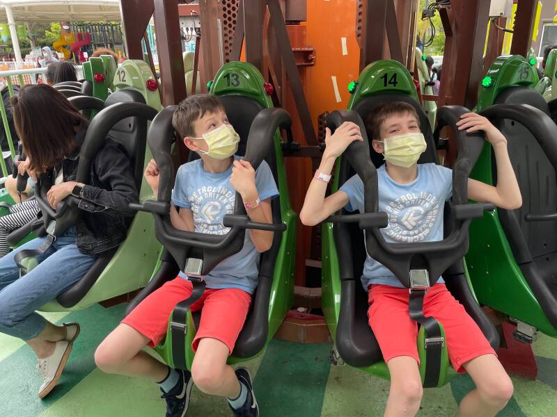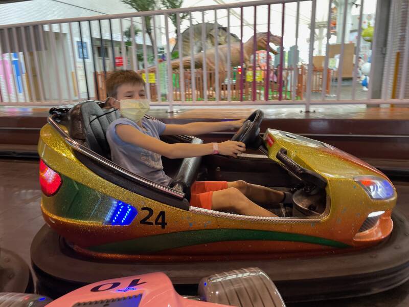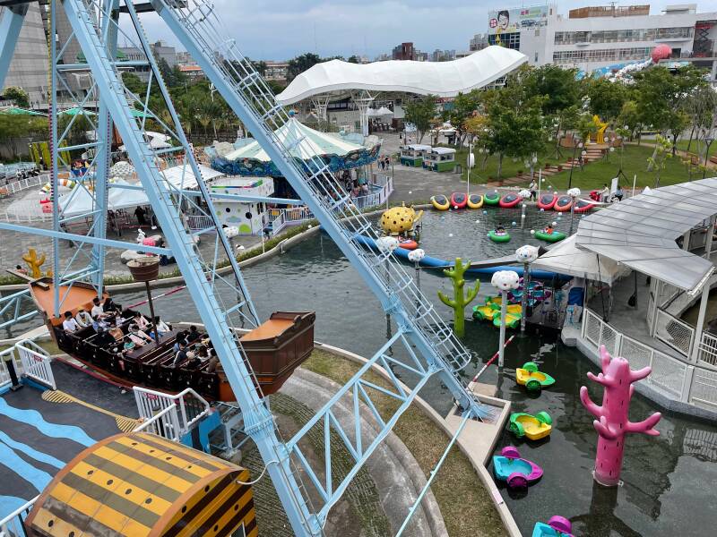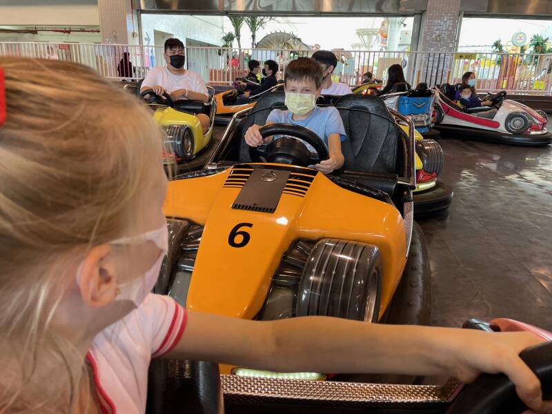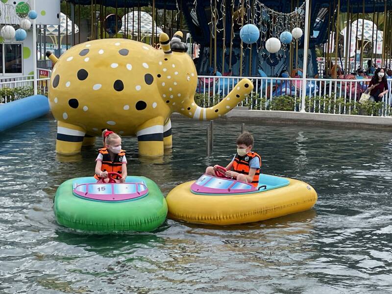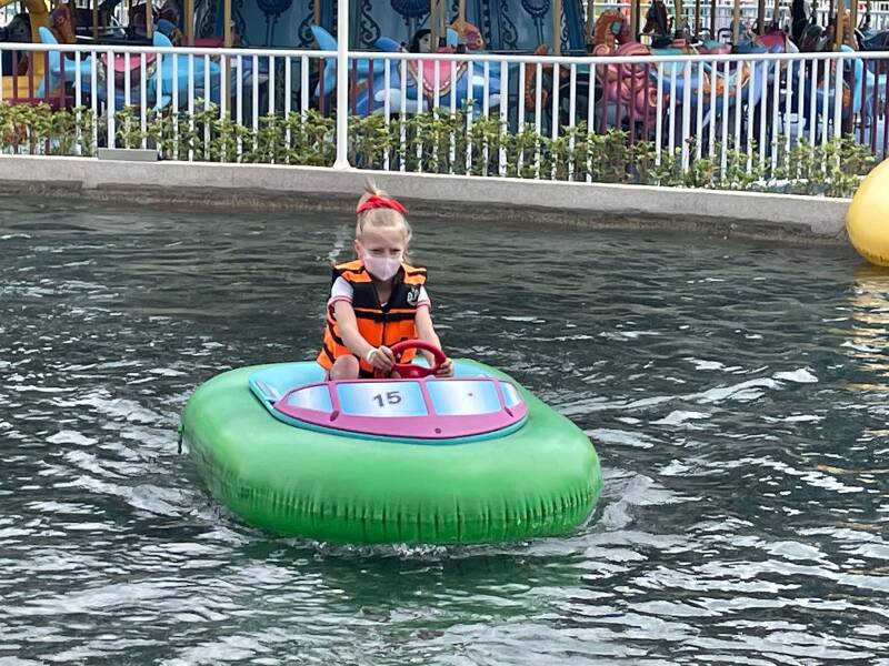 Daarna wilde Ellis graag in een soort 'botsbootjes'. Er was geen rij, dus we konden er zo in. Nou ja, zo... voor deze attractie bleek je extra te moeten betalen. Ik vond Noah en Ruben er al best groot voor, maar Ellis wilde er heel graag in. Noah vond zichzelf er ook al wel een beetje te groot voor en had het er absoluut niet voor over om bij te betalen, maar Ruben wilde het natuurlijk wel even uitproberen ook al was hij er eigenlijk ook al wel te groot voor. Het water is niet diep, maar alle kinderen moeten een zwemvest om, omdat het in Taiwan niet zo vanzelfsprekend is dat kinderen kunnen zwemmen. Ruben en Ellis werden in het bootje geholpen door een vrouw die hier de hele dag met lieslaarzen door het water loopt te banjeren. Haar collega zat de meeste tijd op haar telefoon te kijken en hielp alleen bij het in- en uitstappen. Na een paar minuten was het alweer over met de pret.