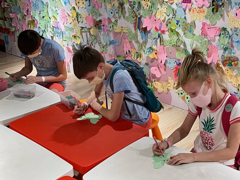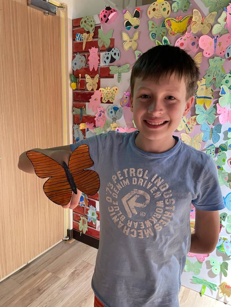 Aan het einde van de tentoonstelling konden Noah, Ruben en Ellis nog een vlinder maken en op de muur achter laten. Nou, dat vonden ze nog wel leuk, dus dat hebben we ook nog gedaan en daarna was het echt tijd om naar huis te gaan! Het was een geslaagde dag!